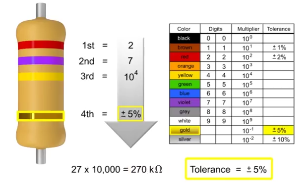 - The fourth colour is gold. The corresponding tolerance value is ±5%. This means that there is a 5% deviation from the actual resistance value, either more than or less than.