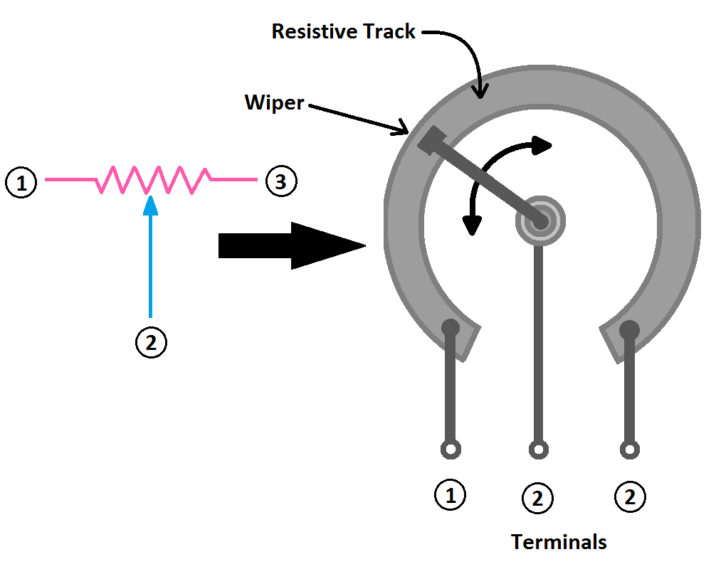 Potentiometers consist of three main components: a resistive element, the wiper, and three terminals.